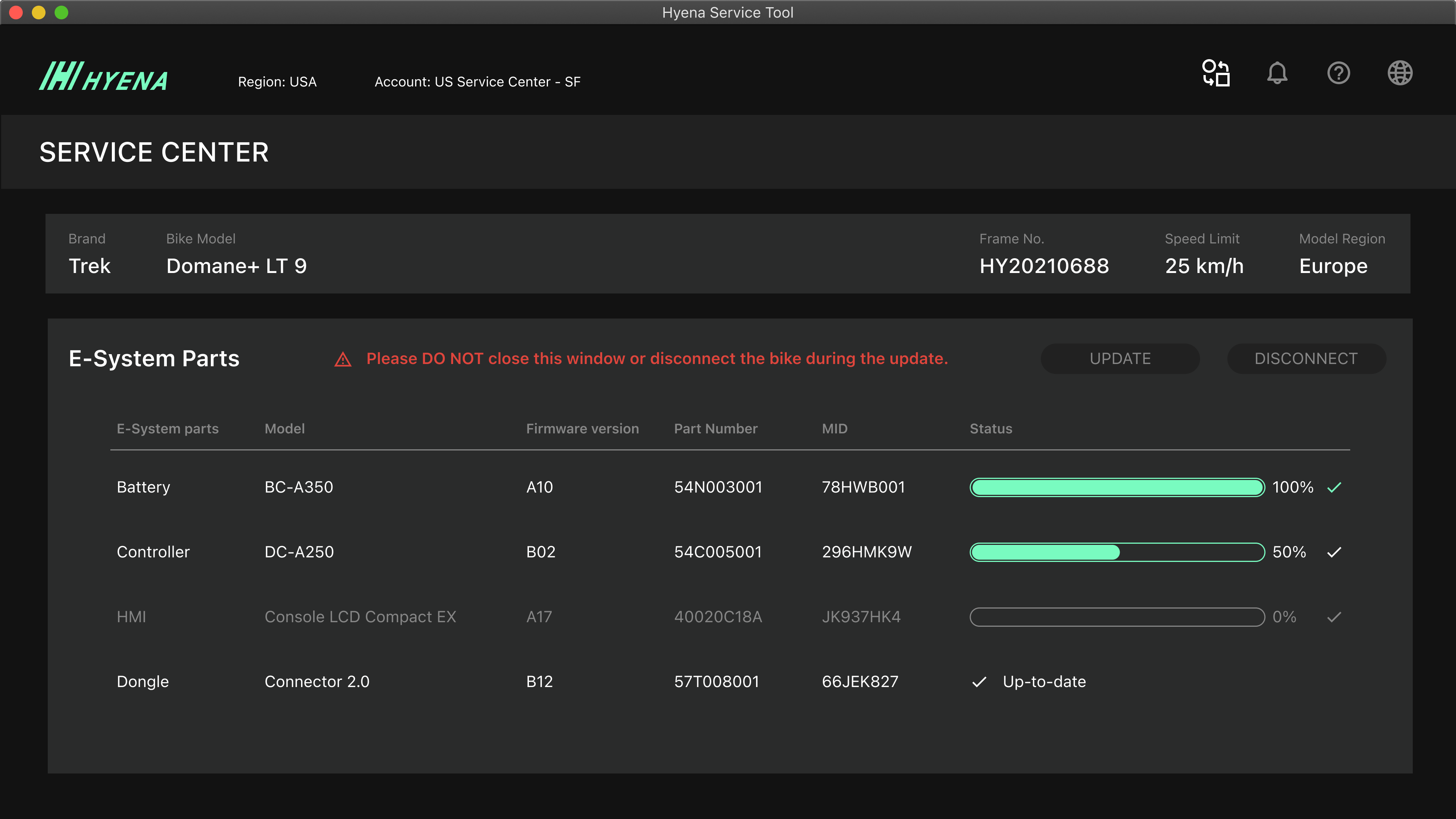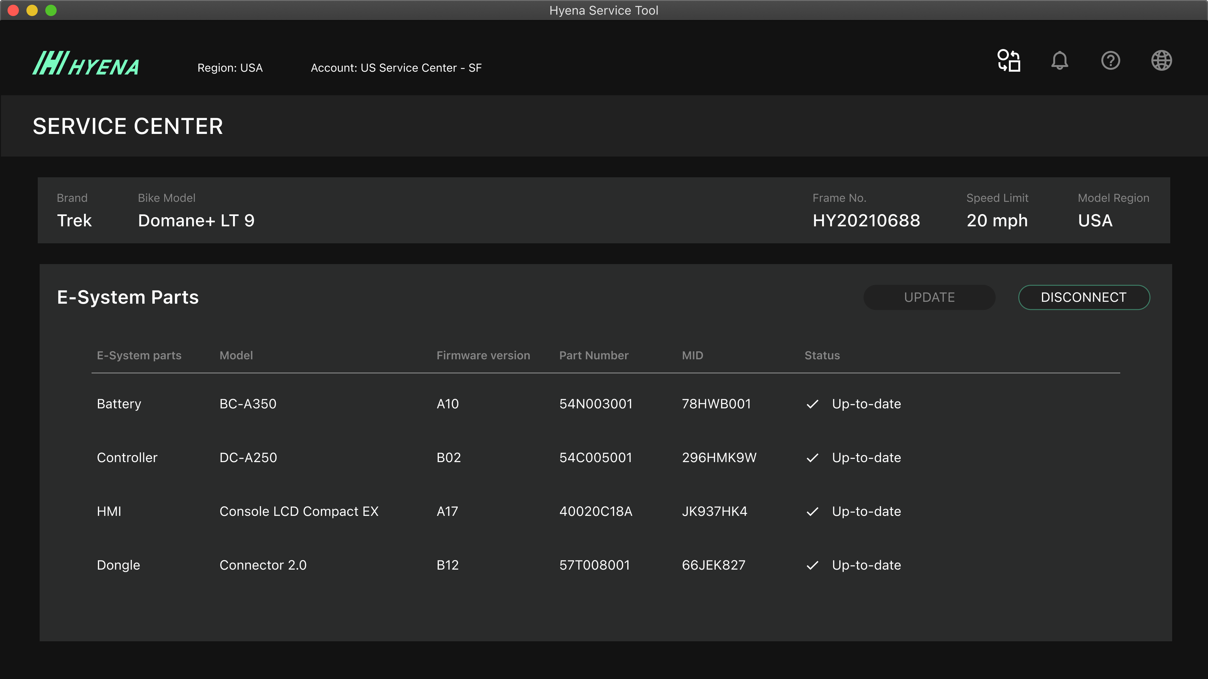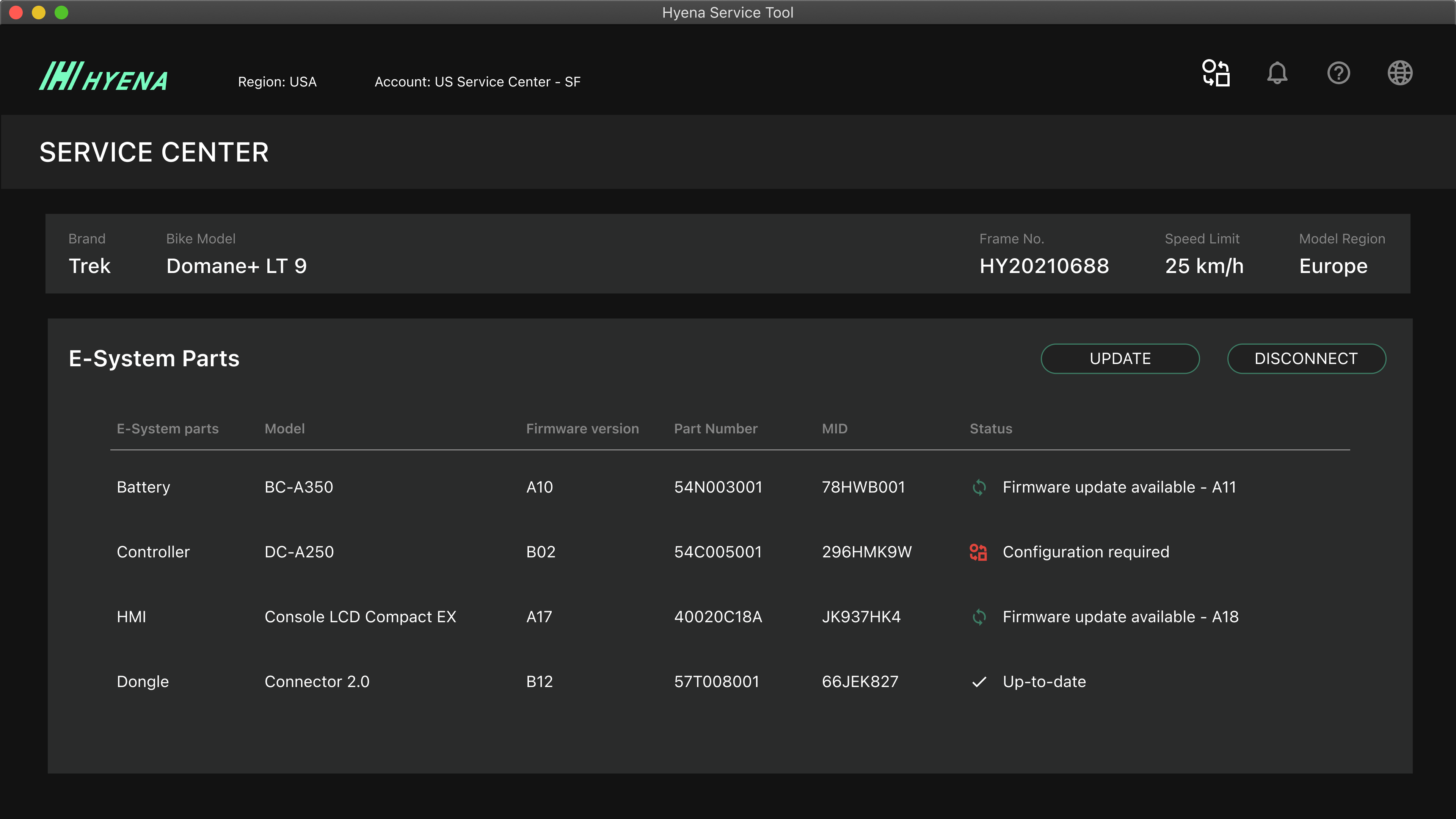Once the e-bike is connected, it would show all of the detailed information about the bike, from its part no. to whether the bike requires firmware update or re-configuration.