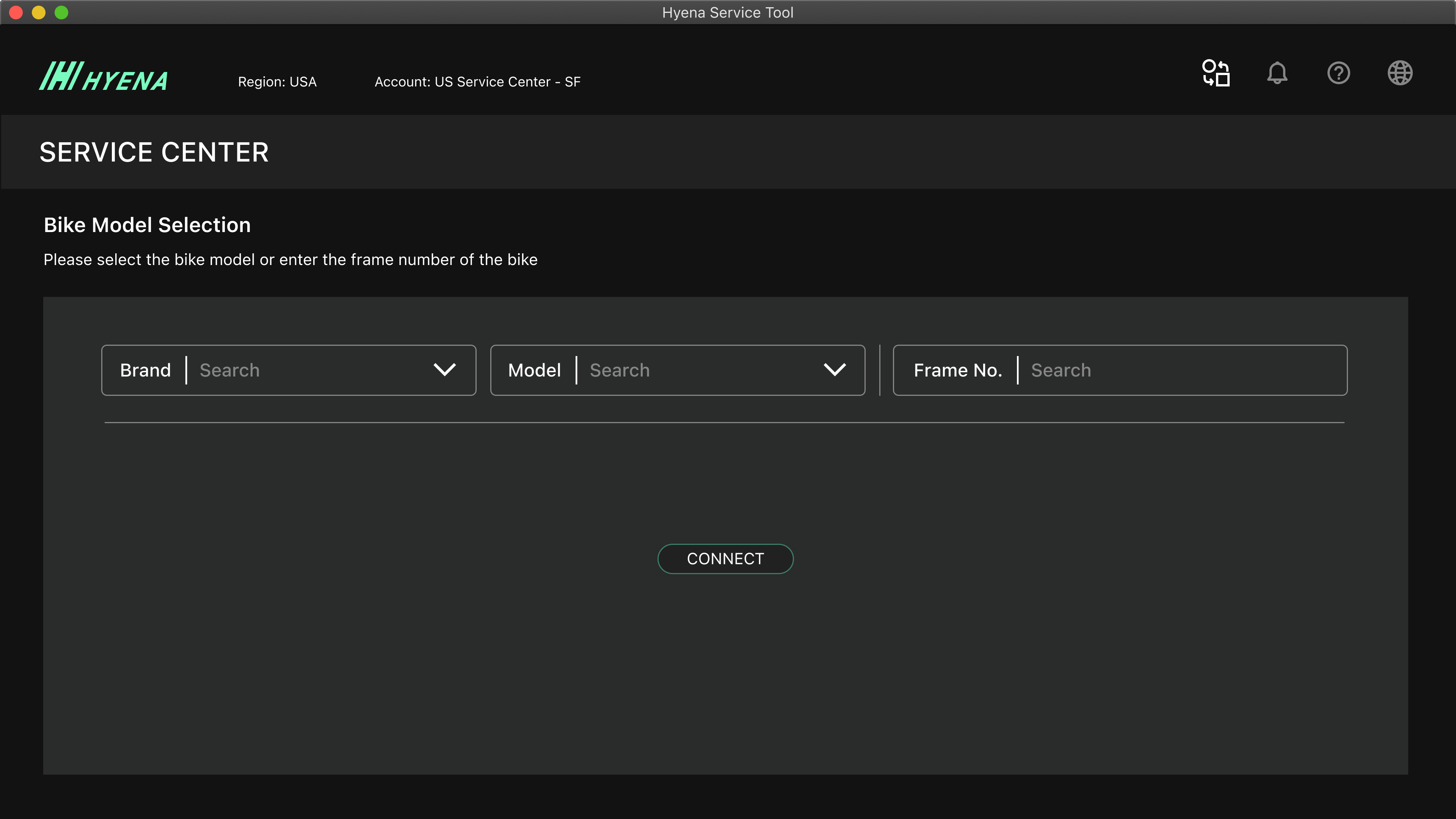 To provide a consistent user experience, we integrate the service center features into the existing bike service tool. We add an icon in the top left corner menu for access to the service center feature page.